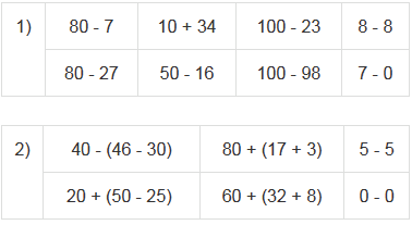 | 2) 40 - (46 - 30) = 40 - 16 = 40 - 10 - 6 = 30 - 6 = 24 | 80 + (17 + 3) = 80 + 20 = 100 |