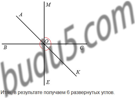 Проведите три прямые, пересекающиеся в одной точке. Запишите все развернутые углы, образовавшиеся при этом.
