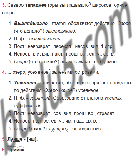 1) Северо(западнее) горы выглядывало широкое горное озеро усея(н, нн)ое зелёными островами. 2) Где(то) дале-ко(далеко) на берегу речки ж..лтым пятном выделялся (н..)большой прииск. Но всего лучше был лес выстилавший горы до самого верха... 3)Эх, хорошо!.. скажешь (н..)вольно глядя на этот (н..)объятный простор едва тронутый двумя(тремя) точками человеческого жилья. 4) Утром горы (н..)обыкнове(н, нн)о хороши и (н..)вольно пережива..шь такое бодрое и хорошее чувство забывая об усталости и всех (н-.)взгодах охотничьего бродяжничества. 5) Голубое небо точно выше, и дыш..тея так легко. На горизонте уже круглятся белые грозовые тучки где(то) заш..птала в траве первая струйка поднявшегося ветра... Стоишь, смотр..шь и, кажется, не ушёл бы (от)сюда.