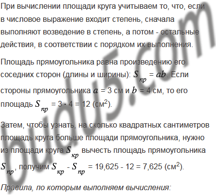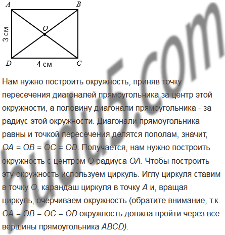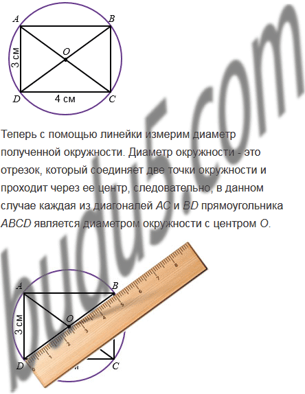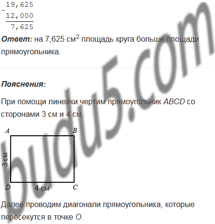 Начертите прямоугольник со сторонами 3 см и 4 см. Проведите диагонали прямоугольника. Приняв точку пересечения диагоналей за центр окружности, а половину диагонали - за радиус, проведите эту окружность. Измерьте линейкой диаметр полученной окружности (в сантиметрах с точностью до единиц). На сколько квадратных сантиметров площадь круга, ограниченного этой окружностью, больше площади прямоугольника?