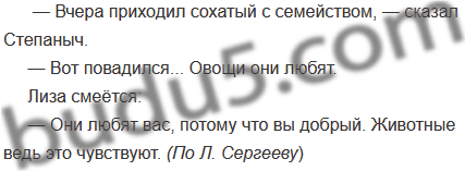 «Вчера приходил сохатый с семейством. Вот повадился... Овощи они любят», — сказал Степаныч. Лиза смеётся: «Они любят вас, потому что вы добрый. Животные ведь это чувствуют». (По Л. Сергееву)