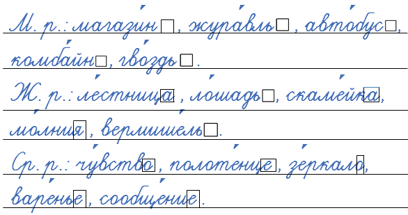 М. р.: магази́н , жура́вль , авто́бус , комба́йн , гво́здь  .