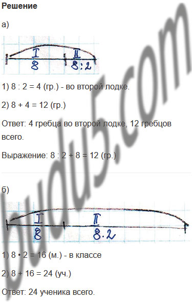а) В первой лодке 8 гребцов, а во второй - в 2 раза меньше. Сколько гребцов во второй лодке? Сколько всего гребцов?