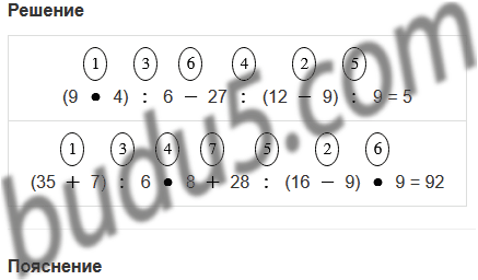 | (9 • 4) : 6 - 27 : (12 - 9) : 9 | (35 + 7) : 6 • 8 + 28 : (16 - 9) • 9 |