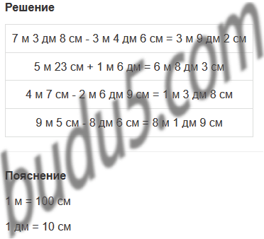 | 5 м 23 см + 1 м 6 дм | 9 м 5 см - 8 дм 6 см |