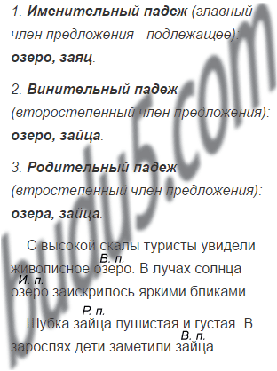 И. п.: озеро, заяц. В. п.: озеро, зайца. Р. п.: озера, зайца.