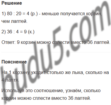 Задание № 8. На 20 корзин уходит столько же лыка, сколько требуется для того, чтобы сплести 80 лаптей. Сколько корзин можно сплести вместо 36 лаптей?