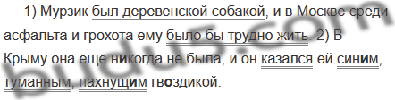 1) Мурзик был деревенской собакой, и в Москве среди асфальта и грохота ему было бы трудно жить. 2) В Крыму она ещё н..когда не была и он казался ей син..м туманным пахнущ..м гв..здикой.