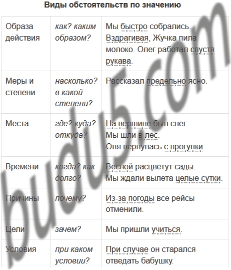 Прочитайте теоретический материал о видах обстоятельств и представьте его в форме таблицы, в которой обязательно приведите свои примеры. Словами каких частей речи могут быть обстоятельства? Включите ответ на этот вопрос в свою таблицу.