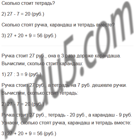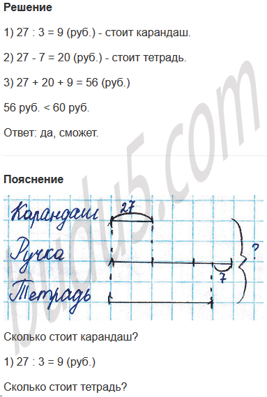 Задание № 7. Ручка стоит 27 руб., она в 3 раза дороже карандаша. Тетрадь на 7 руб. дешевле ручки. Сможет ли Оля купить ручку, карандаш и тетрадь, если у неё есть 60 руб.?