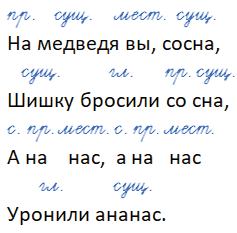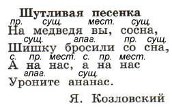 Стихотворение интересно игрой слов, автор использует слова, относящиеся к разным частям речи, имеющие разное значение, но звучащие одинаково.