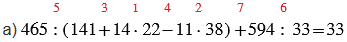 а) 465 : (141 + 14 • 22 - 11 • 38) + 594 : 33;