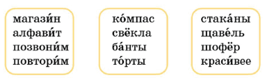 | магази́н алфави́т позвони́м повтори́м | ко́мпас свёкла ба́нты то́рты | стака́ны щаве́ль шофёр краси́вее |